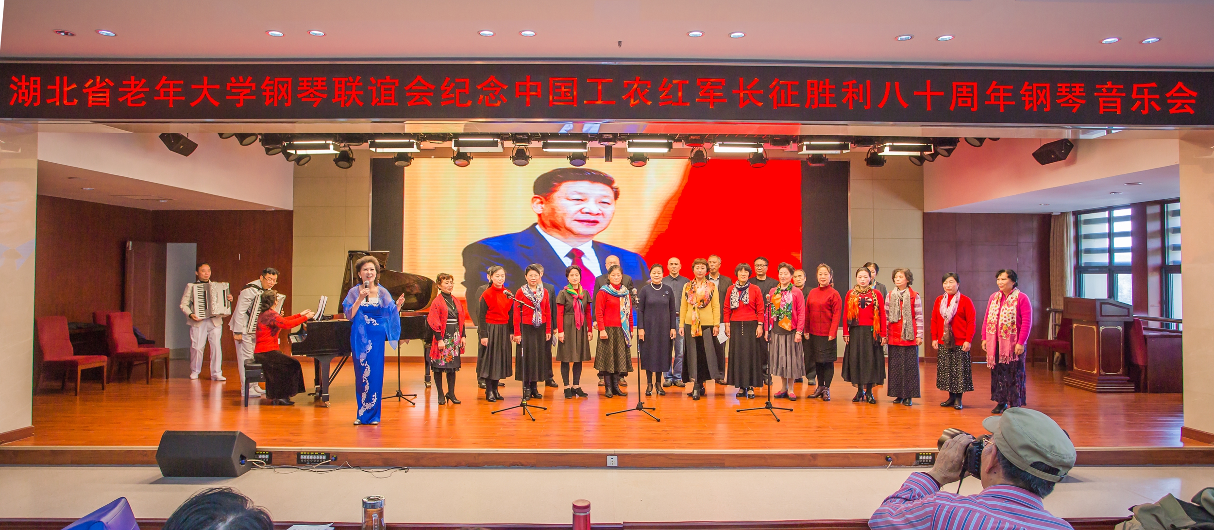 11月4日上午学校401阶梯教室,正在举办一场由湖北省老年大学活动管理一处主办,湖北省老年大学钢琴联谊会协办的纪念中国工农红军长征胜利八十周年钢琴音乐会。大厅内气氛热烈,高朋满座,武汉市音协副会长兼秘书长、武汉市中老年钢琴联谊会会长陈治海教授及武汉市老年大学、武昌区老年大学和洪山区老年大学钢琴联谊会均派学员参加,李辉副校长到会致词。太阳最红,春风最暖,毛主席的恩情比山高比海深,毛泽东思想永远指引着我们前进的方向,当一位经历过长征老红军的女儿饱含泪水奏响太阳最红毛主席最亲,音乐会正式拉开序幕。