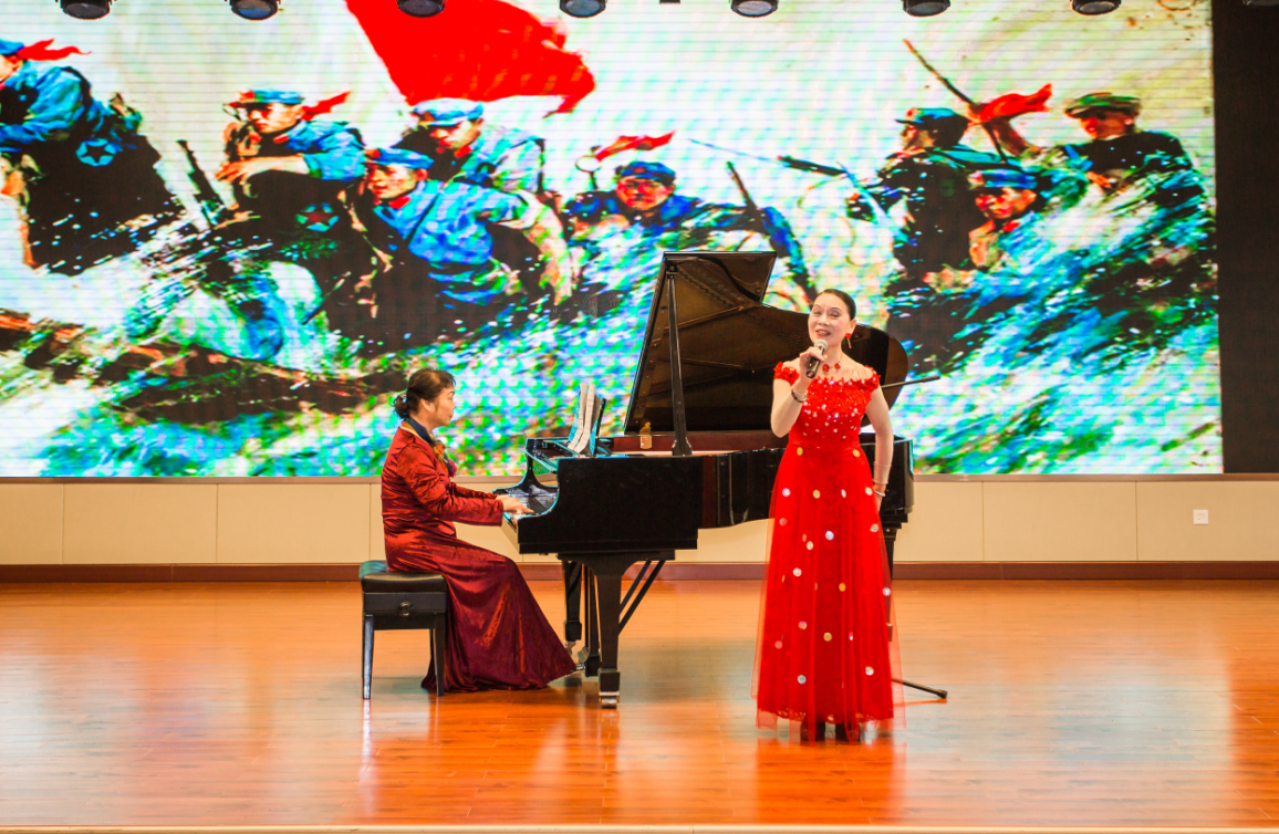 北风吹,讲述了主人公喜儿由人变成鬼,由鬼变成人的新旧社会以两重天的经历;大红枣儿献亲人、万泉河水清又清,十送红军,红军所到之处军纪严明,红军所到之地人民翻身做主人,人民群众与子弟兵鱼水情深,军爱民来民拥军,军民鱼水一家亲。南泥湾,延安大生产运动,开创红军自给自足的历史先河。徐尧老师的一首芭蕾舞剧红色娘子军组曲把音乐会推向高潮。看着LED大频上一幅幅滚动的画面,耳边响起一首首红军北上抗日的乐曲,一下把我们从现实拉回到那个残酷的战争年代,在血与火的洗礼中,在毛主席和中国共产党的领导下,中国人民经历了艰苦卓绝的八年抗战,军民团结一心,同仇敌忾,不怕牺牲,终于赶走了侵略者。一首首抗战乐曲,谱写中国人民不畏强暴,不屈不挠的民族精神,我们的人民更加勇敢,中国更加坚强!一曲手风琴二重奏游击队之歌,又一次将音乐会推向高潮。一曲绣金匾唱出了人民对毛主席、周总理、朱德等老一辈无产阶级革命家的热爱和无限崇敬;见了你们格外亲,无论在战争年代还是和平年代,中国军人始终保持着红军传统,长征精神,冲锋在前,吃苦在先,人民由衷的感谢你们。红军长征精神激励着我们中华儿女勇往直前勇攀高锋。我们站在世界之林,攀登在一条走向中华民族伟大复兴强盛的能天大道路上!