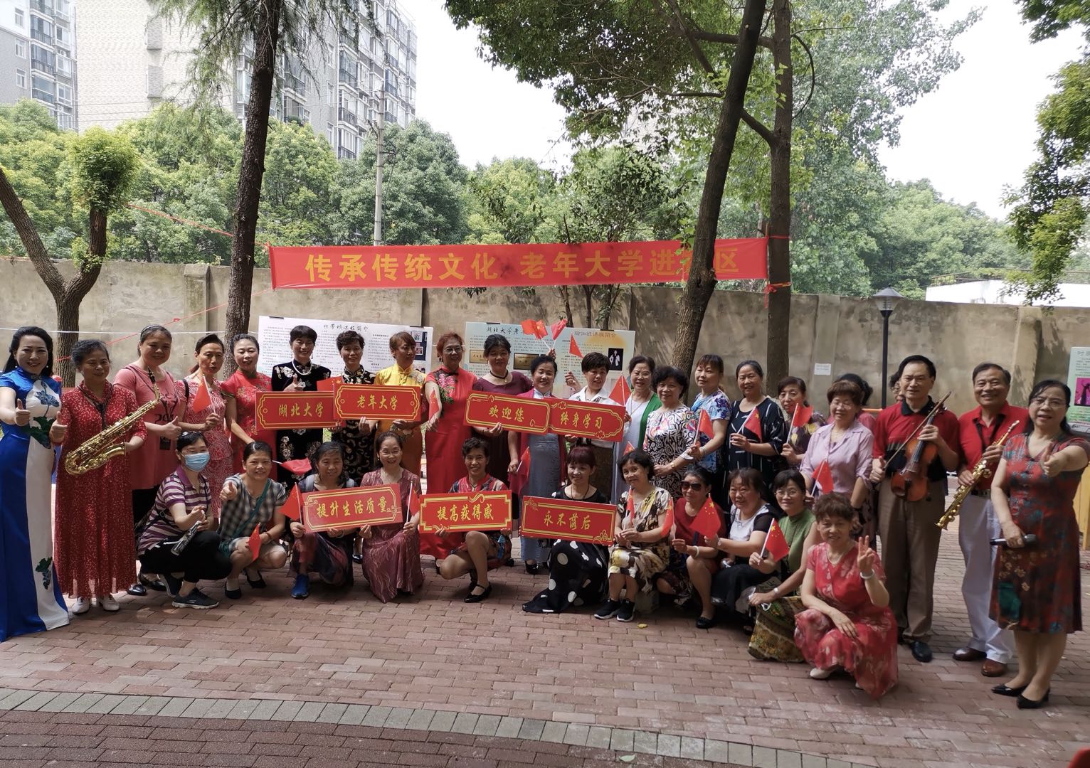 为庆祝中国共产党建党100周年,6月9日至11日,湖北大学老年大学在校内家属区、教师琴园小区、教师忠诚公寓三个教工小区开展了“传承传统文化,老年大学进社区”系列公益宣传活动。活动以班级为单位,以体现中国传统文化的“三秀”为主题,内容丰富多彩。