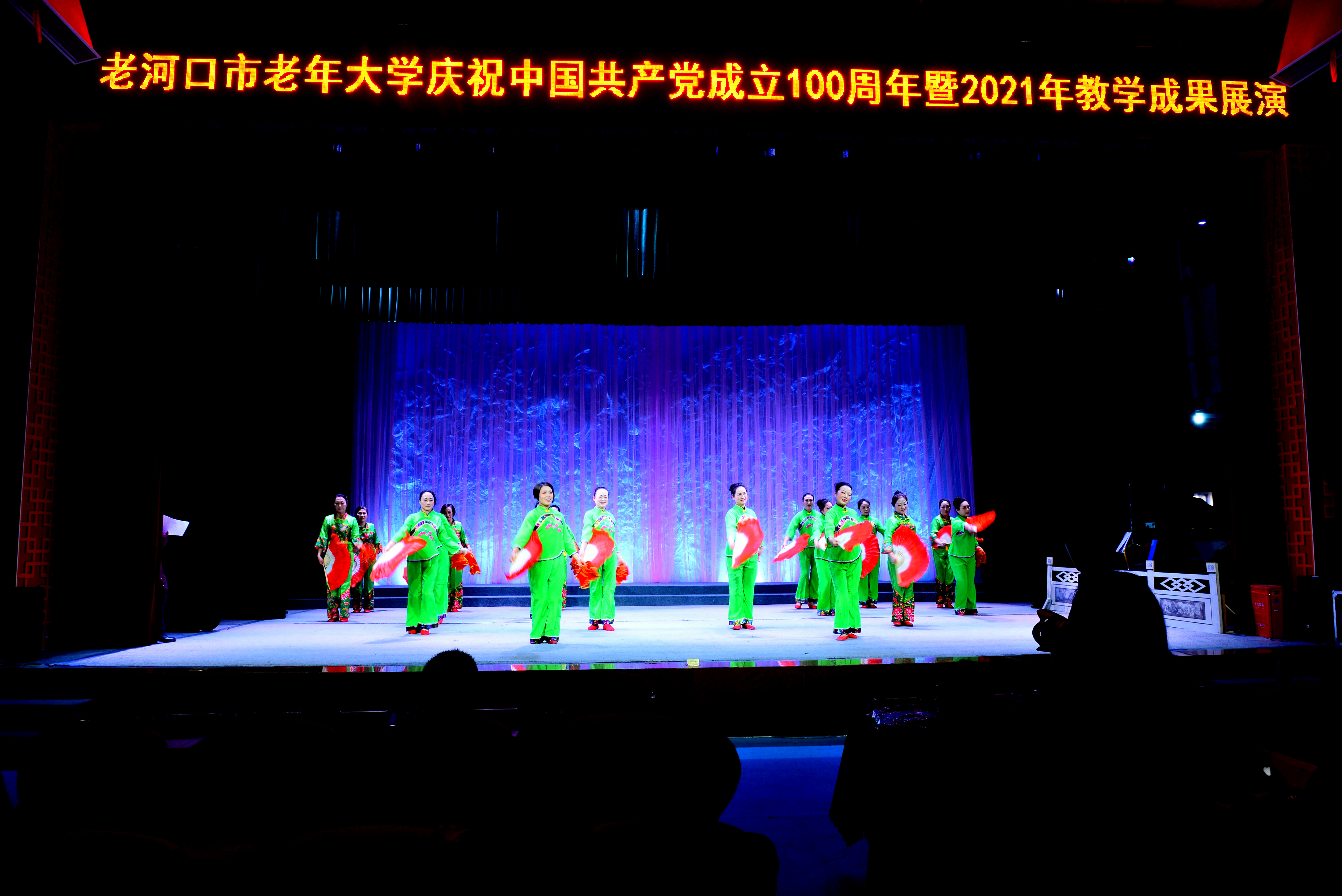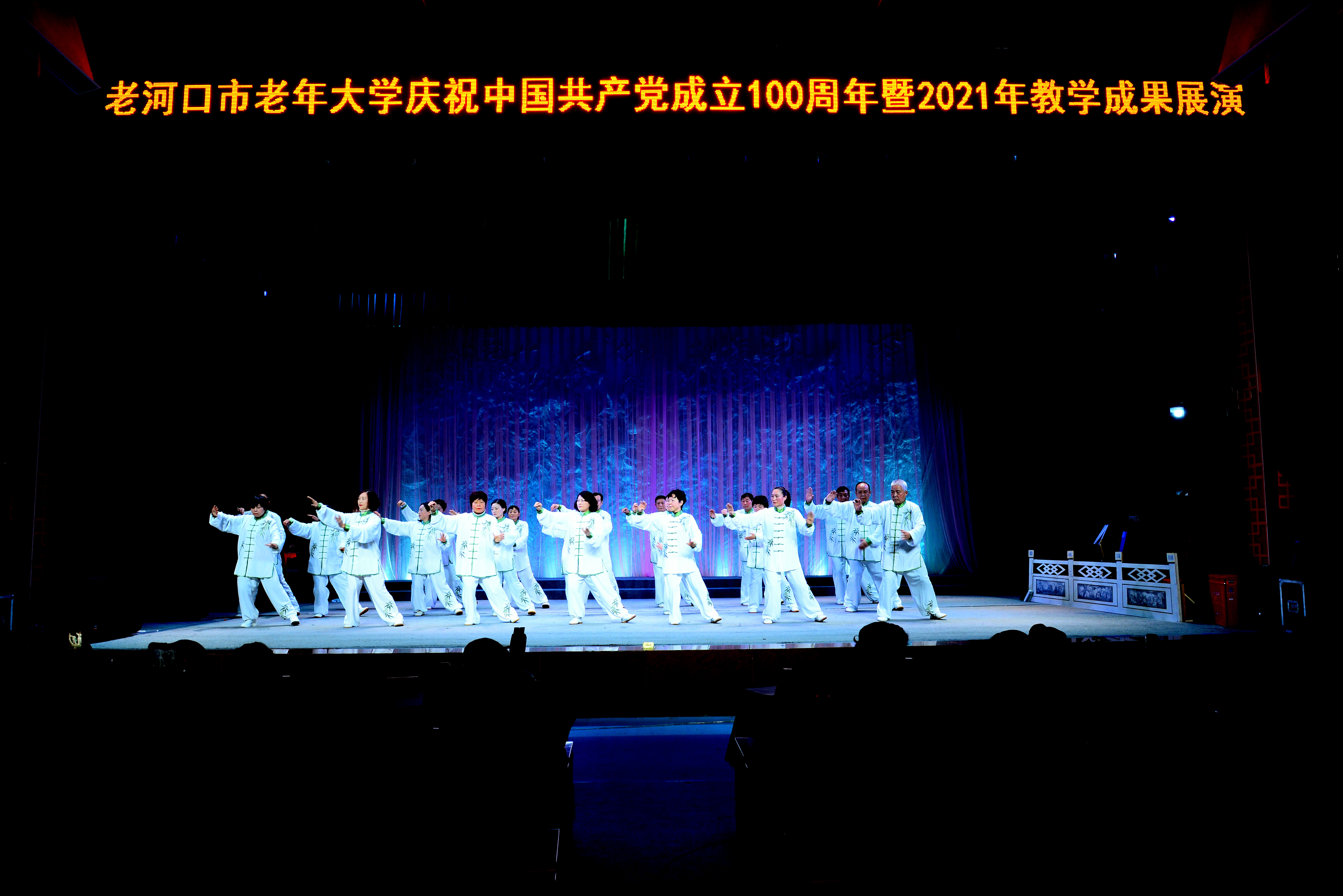 为深入学习贯彻习近平新时代中国特色社会主义思想和党的十九届六中全会精神,进一步丰富校园文化生活,展示教学成果,12月21日,老河口市老年大学“庆祝中国共产党成立100周年”暨2021年教学成果展演,在市七七剧场隆重举办。市老年大学全体工作人员及全体师生1500余人参加演出。