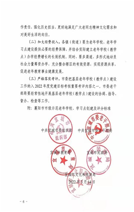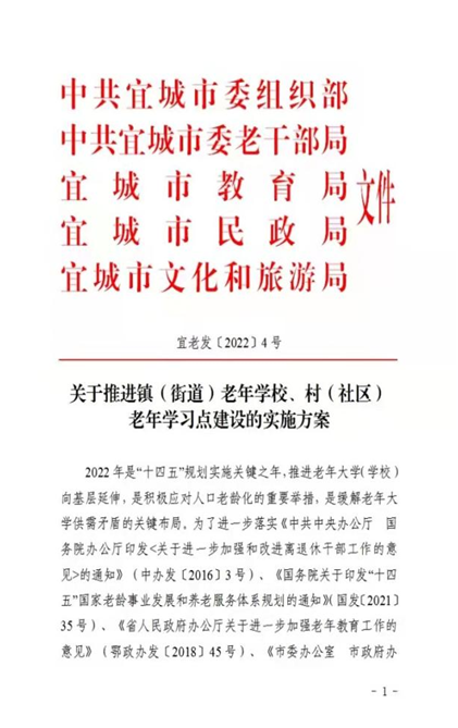 3月16日,宜城市委组织部、市委老干部局、市教育局、市民政局、市文化和旅游局联合发布《关于推进镇(街道)老年学校、村(社区)老年学习点建设的实施方案》。
