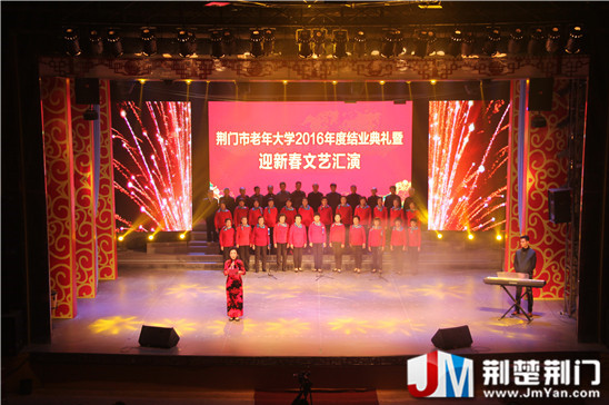 荆楚荆门网讯(罗蒙 何红芳)一曲曲颂歌感党恩,一池池曼舞展风采。12月20日下午,荆门市老年大学在荆门市艺术剧院举行2016年度结业典礼暨迎新春文艺汇演,鹤发童颜的演员们用悉心准备的结业作品汇报展示学员们“老有所学、老有所乐、老有所为”的学习成果。