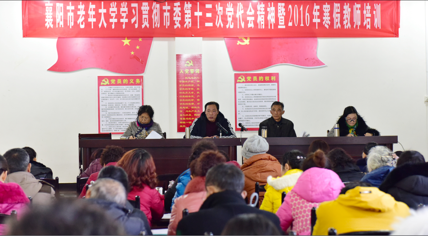 (通讯员:庞静)襄阳市第十三次党代会召开后,市老年大学高度重视,迅速部署,分层次召开专题会议,全面学习党代会精神。首先,召开校务扩大会议,传达学习党代会精神,并就学习宣传贯彻会议精神、结合老年大学实际抓好当前工作进行了安排部署。由市老年大学校长刘德政主持会议,在该校学习的“四大家”老领导、全体干部职工、各系主任和学委会成员参加了会议。会上,校党委书记、常务副校长刘军传达了省委常委、市委书记任振鹤同志所作的报告《提升首位度打造增长极争当排头兵奋力开创“两个中心、四个襄阳”建设新局面》。市老领导郝桂萍、徐建初、李诗刚及其他同志分别就党代会报告进行了讨论发言。精神的感悟,现场的感染,激发了老领导郝桂萍激情,现场激动地歌唱入党誓词,并向学校党组织递交了《入党申请书》,她诚恳的说“我一直是无党派人士,加入中国共产党是我一直以来的心愿,希望组织能够接收我的申请”。