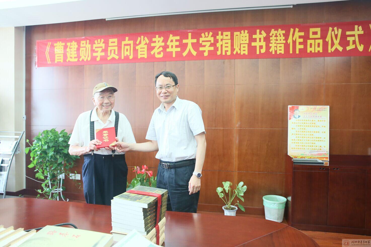 (通讯员 王松)在省老年大学建校30周年之际,怀着对学校真挚的感情,6月29日,原湖北作协文学院副院长、国家一级作家、省老年大学学员曹建勋向省老年大学捐赠《曹建勋文集》、《大漠烟》等个人著作10套103本。严红副校长、教学管理处、宣传调研处、校学委会等有关同志参加了捐赠仪式。